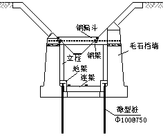 在地下通廊結(jié)構(gòu)中,鋼漏斗內(nèi)鐵礦原料通過鋼梁對(duì)毛石擋墻施加豎向力。由于鋼漏斗內(nèi)原料高度經(jīng)常大于設(shè)計(jì)高度,使得毛石墻受到來自鋼漏斗較大的恕向壓力,造成毛石墻的基礎(chǔ)下沉,為了避免毛石墻基礎(chǔ)進(jìn)一步下沉,需要對(duì)其進(jìn)行加固處理。地下通廊皮帶槽與毛石墻體之間的最大距離約1.5m,最小距離0.5m,機(jī)械設(shè)備無(wú)法進(jìn)行施工,同時(shí)整個(gè)加固施工期間不能影響生產(chǎn)的正常運(yùn)行,經(jīng)過多方論證,決定采用人工成孔的微型樁(樹根樁)對(duì)毛石擋墻基礎(chǔ)進(jìn)行托換處理。通過增加的鋼筋混凝土立柱、地梁和微型樁組成的豎向受力體系分擔(dān)來自鋼梁的壓力(圖7),減小毛石擋墻所受的豎向力,從而減小其沉降。