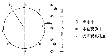 根據(jù)傾斜觀測結(jié)果沿?zé)焽枳畲髢A斜方向的垂直方向?qū)ΨQ設(shè)置5個(gè)降水井(圖2),沉降觀測點(diǎn)沿?zé)焽璧撞恐荛L范圍等距離布置。經(jīng)過合理的設(shè)計(jì)和精心施工,整個(gè)糾偏工作取得圓滿成功,煙囪的傾斜率達(dá)到并穩(wěn)定在合同規(guī)定的0.8‰之內(nèi)。
