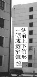 采用掏土灌水法設(shè)計(jì)施工的該項(xiàng)工程,糾傾工作共進(jìn)行了2個(gè)月。各觀(guān)測(cè)點(diǎn)傾斜值全部已回至規(guī)范要求范圍,內(nèi)外縱墻原有裂縫大部分已閉合。從糾傾前照片可以看出,傾斜樓房山墻與鄰近參照建筑物墻體間在垂直方向上形成了上寬下窄的倒錐形縫,糾傾后建筑物與參照建筑物間的倒錐形縫已閉合(圖2)。