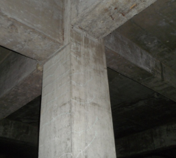 我所技術(shù)人員于2013年7月赴現(xiàn)場進行了檢測,檢測結(jié)果表明,車庫中心位置上浮位移值最大,上浮后柱底最大高層超過20cm??蚣苤谏细∥灰飘a(chǎn)生的附加軸力及附加彎矩的作用下,產(chǎn)生了開裂及壓碎現(xiàn)象(圖3、圖4)??蚣芰憾藗?cè)面部出現(xiàn)了剪切斜裂縫、梁端底部出現(xiàn)水平裂縫(圖5),特別是車庫與高層住宅交界位置,梁端開裂較為明顯。在車庫頂梁板與車庫外周擋土墻交界位置處附加彎矩的作用下,除梁端裂縫外,擋土墻在梁底標高以下位置出現(xiàn)通長水平裂縫。沿車庫平面跨中位置車庫平面縱向,車庫頂板出現(xiàn)兩條通長裂縫;車庫入口處沿車庫平面橫向,車庫頂板同樣出現(xiàn)兩條通長裂縫,頂板裂縫均與上浮位移較大軸線相對應。
