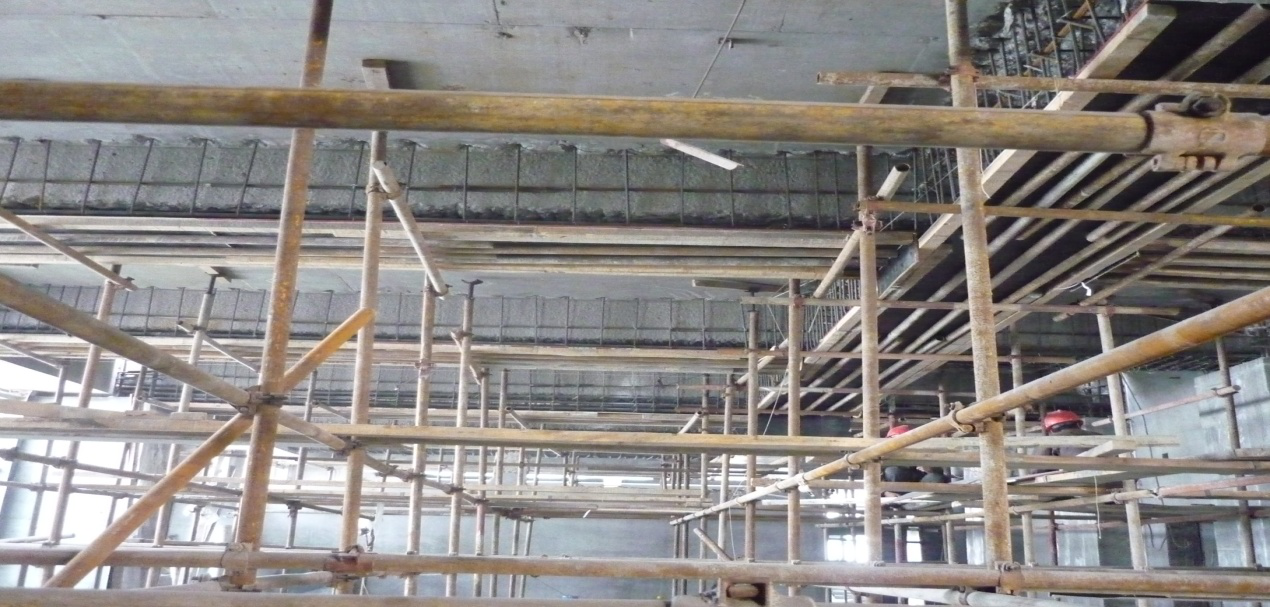 依據(jù)加固設(shè)計(jì)施工圖紙,本工程采用的主要加固施工方法:腳手架支撐卸荷、梁加大截面、柱加大截面、新加框架梁等。主要施工工藝:混凝土界面剔鑿、化學(xué)植筋、特種混凝土澆灌等。特種專業(yè)施工材料:喜利得HILTI HIT-RE 500錨固劑、北京聯(lián)合榮達(dá)RG灌漿料。