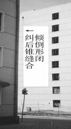 采用掏土灌水法設(shè)計施工的該項工程,糾傾工作共進(jìn)行了2個月。各觀測點(diǎn)傾斜值全部已回至規(guī)范要求范圍,內(nèi)外縱墻原有裂縫大部分已閉合。從糾傾前照片可以看出,傾斜樓房山墻與鄰近參照建筑物墻體間在垂直方向上形成了上寬下窄的倒錐形縫,糾傾后建筑物與參照建筑物間的倒錐形縫已閉合(圖2)。