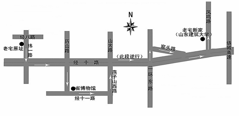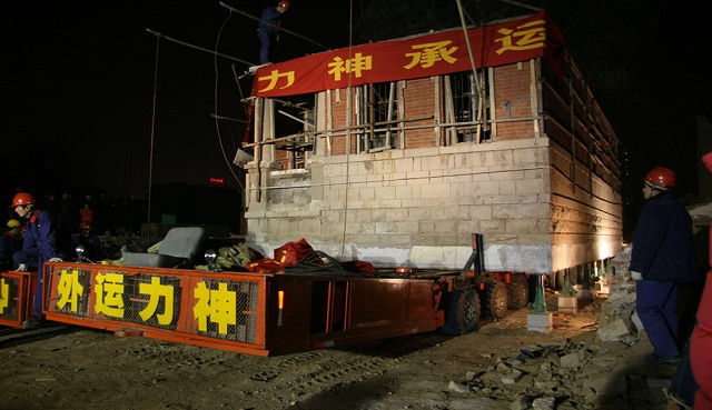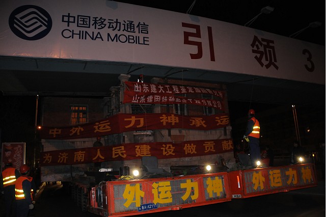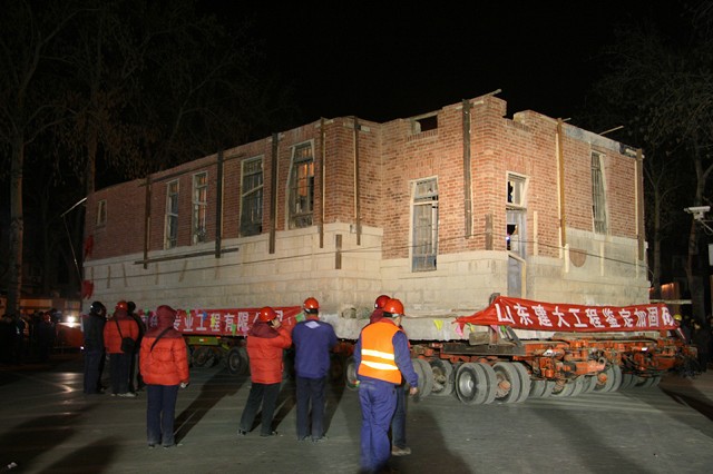 該建筑原位于繁華市區(qū),為了盡量減輕道路交通壓力, 對(duì)運(yùn)輸線路進(jìn)行了詳細(xì)勘察,遷移于3月1日21:38分開(kāi)始,遷移過(guò)程中,老別墅四次屈身過(guò)街天橋,三過(guò)立交,于3月2日11:43安全到達(dá)山東建筑大學(xué)新校區(qū)。整個(gè)遷移過(guò)程歷時(shí)14小時(shí),遷移距離為30公里。