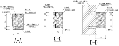 建筑物最初作為倉庫使用,棚戶區(qū)改造后作為歷史保護建筑規(guī)劃為官扎營基督教堂。加固設(shè)計本著修舊如舊的思路,在盡量保留建筑原貌且滿足使用功能要求的前提下采取必要的加固處理措施:對承重木架進行受力分析(木架加固平面見圖3、立面見圖4),對承載力不足的木架柱采取新增截面方式進行加固(圖5中A-A、C-C斷面),通過外包碳纖維箍、增設(shè)木螺釘、結(jié)合面涂結(jié)構(gòu)膠的措施使新舊截面緊密結(jié)合共同受力;木架柱加固的同時,加強維護磚墻與木架柱的拉結(jié)(圖5中D-D斷面),提高圍護墻的穩(wěn)定性;木架上部缺陷桿件同樣采用新增截面的加固方式,并更換不滿足受力要求的木框架鋼拉桿;山墻內(nèi)側(cè)增設(shè)圈梁構(gòu)造柱,屋面標(biāo)高處新增與山墻拉結(jié)的水平支撐,提高山墻抗風(fēng)能力及平面外穩(wěn)定性;屋面整體維修,新加次檁條,次檁條上鋪設(shè)20厚木望板,木望板上設(shè)掛瓦條及順?biāo)畻l,保留原瓦,更換壞瓦。